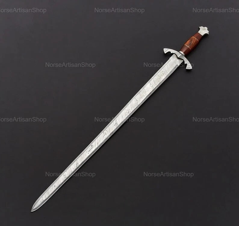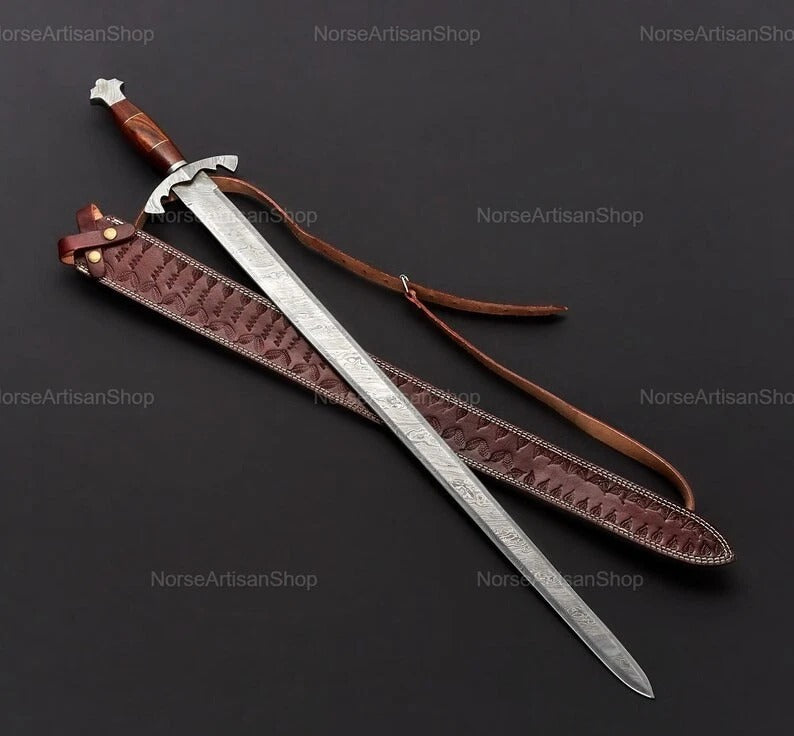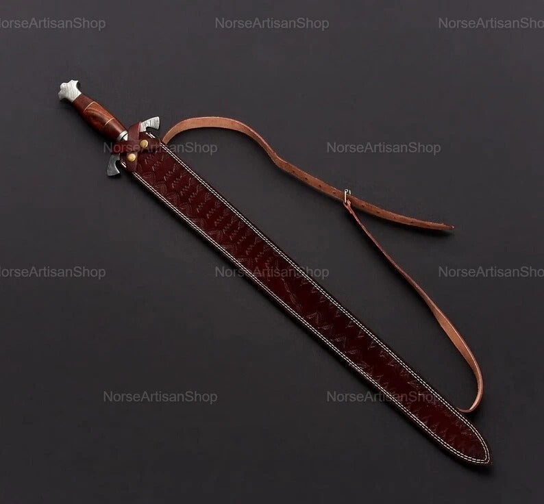 Crafted with precision and passion, this beautifully handmade Viking-style decorative sword is an exceptional tribute to medieval artistry. The blade features a captivating ocean current Damascus steel pattern, making it an eye-catching display piece for your home, office, or personal collection.