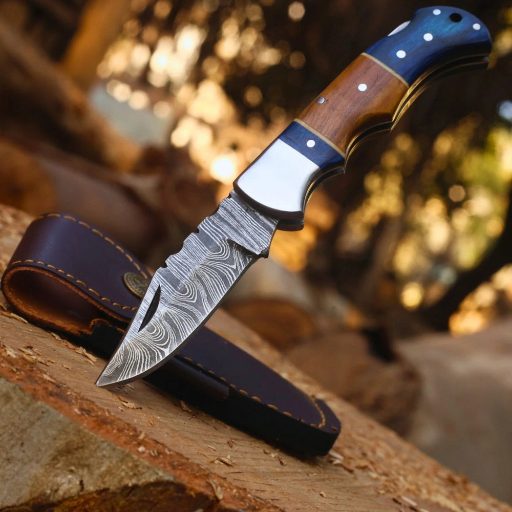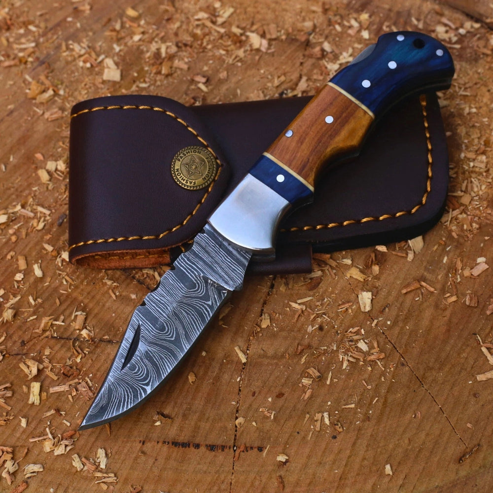 Crafted with precision and style, this Damascus steel folding knife combines strength, elegance, and practicality. Featuring a secure back lock mechanism and a hand-stitched leather sheath, it’s designed for everyday carry and outdoor use.
