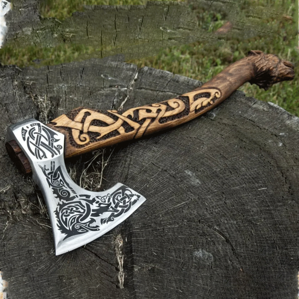 Discover the artistry of craftsmanship with our Handcrafted Viking Axe, designed to bring strength and style to your outdoor adventures. Featuring a beautifully carved wooden handle with intricate engravings, this unique survival tool combines both functionality and aesthetics. Whether you're chopping wood or showcasing this exquisite piece of craftsmanship, it's sure to make a statement.