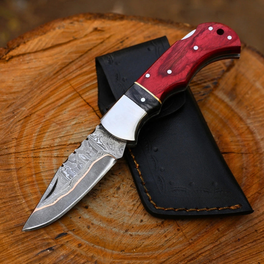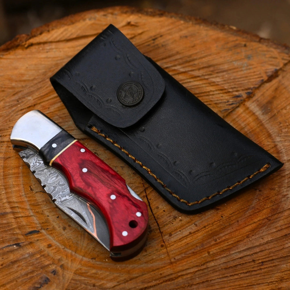 This handcrafted Damascus folding knife is designed with a striking copper finish and red handle, combining durability with bold style. Compact and practical, it makes a perfect everyday carry (EDC) tool as well as a standout collector’s piece.