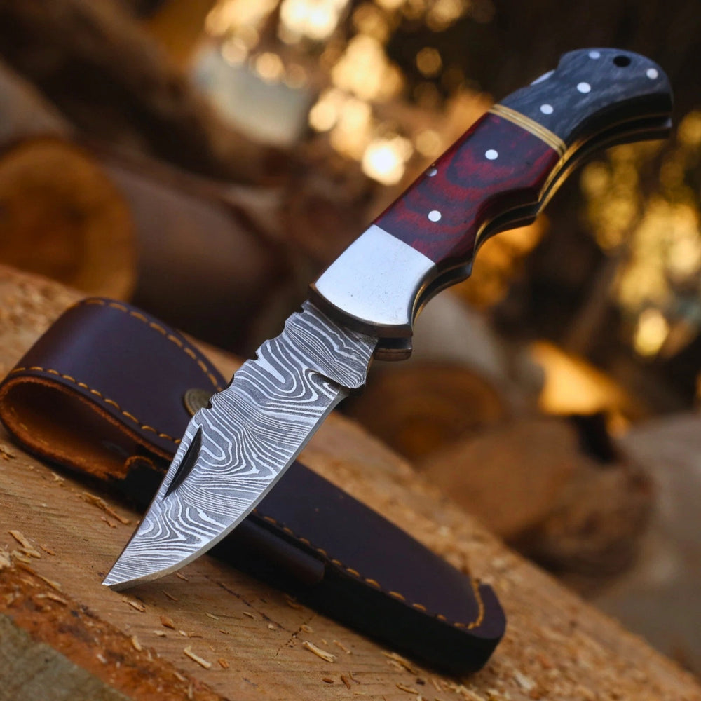 This handcrafted Damascus steel folding knife is built for strength, style, and everyday practicality. Featuring a secure back lock mechanism and a compact design, it’s perfect for camping, outdoor use, or everyday carry (EDC). A genuine leather sheath is included for safe storage and easy portability.