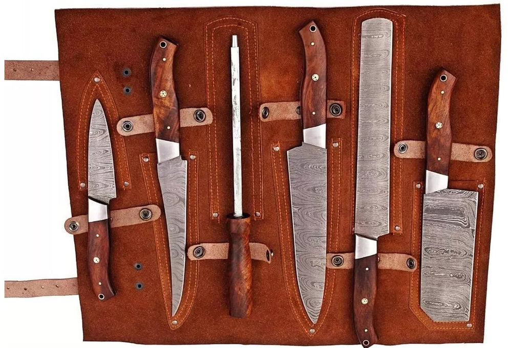 Enhance your culinary experience with our Premium Handmade Damascus Steel Chef Knife Set. This 5-piece set includes precision-forged knives made from high-carbon Damascus steel, known for its incredible sharpness, durability, and beautiful pattern. Each knife features a comfortable, ergonomic wooden handle for a secure grip and optimal control. The set comes with a stylish leather roll for safe storage and easy portability, making it a perfect gift for professional chefs and cooking enthusiasts alike.