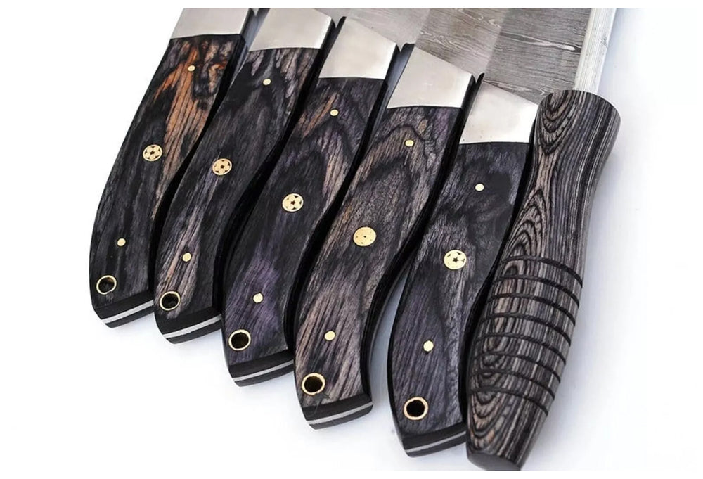 Upgrade your kitchen with our Premium Handmade Damascus Steel Chef Knife Set featuring sleek black wooden handles for a modern, elegant touch. This 5-piece set is meticulously crafted from 512 layers of high-carbon Damascus steel, delivering unparalleled sharpness, strength, and a stunning Damascus pattern. The ergonomic black wooden handles ensure a secure grip and maximum comfort while you prepare your meals. A premium leather roll is included for safe storage and easy portability, making it a perfect gift for culinary professionals and home chefs alike.